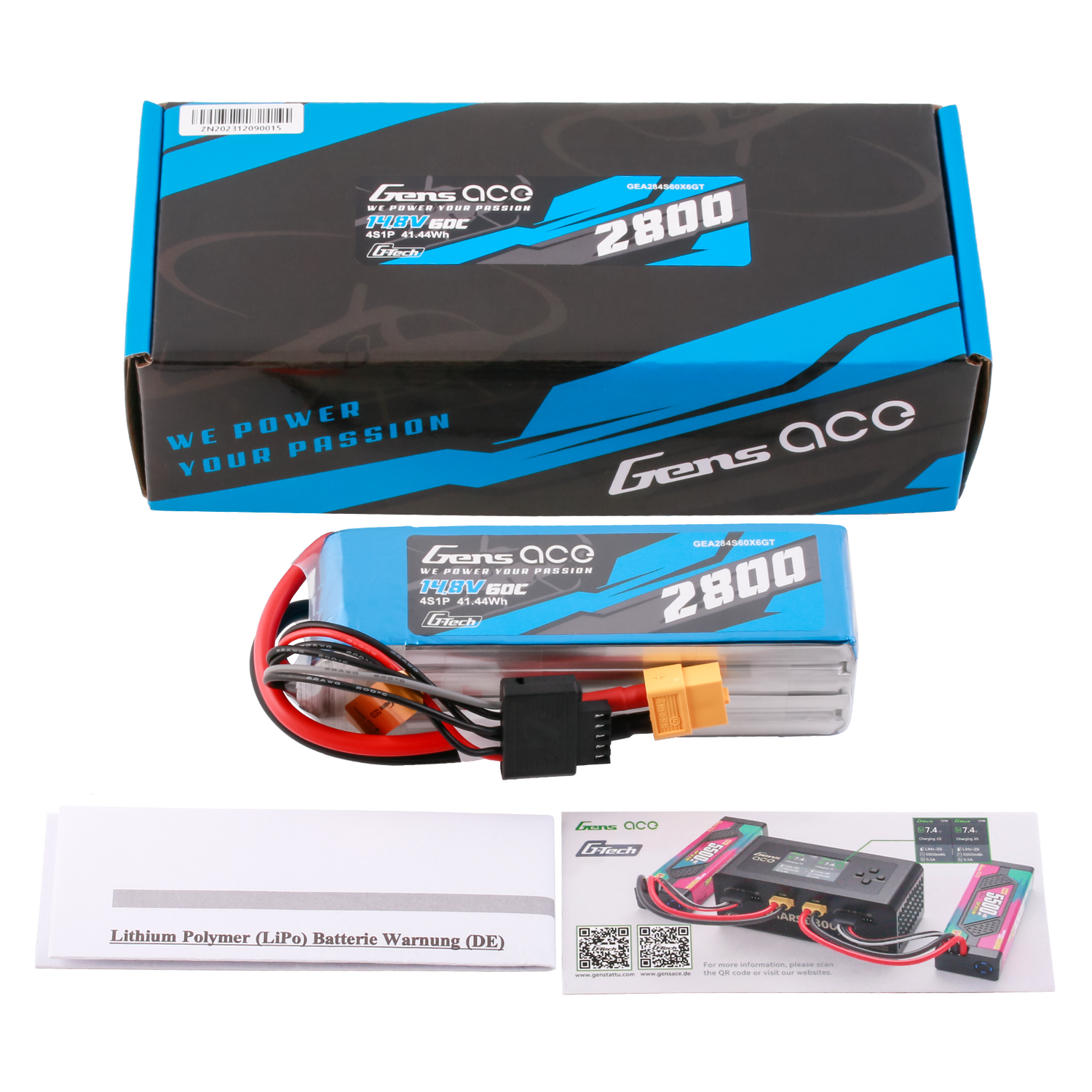 Gens ace G-Tech 2800mAh 14.8V 60C 4S1P LiPo Battery Pack with XT60 Plug Specs: