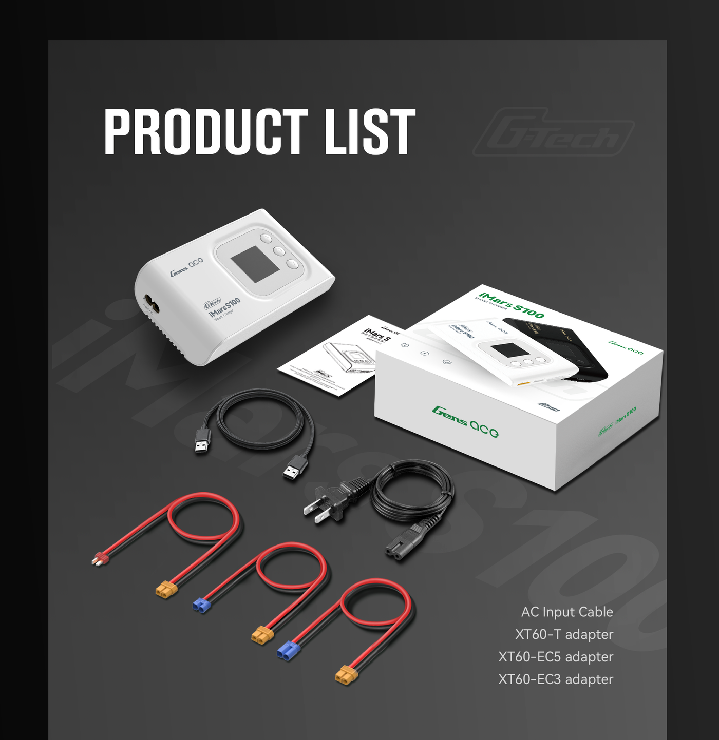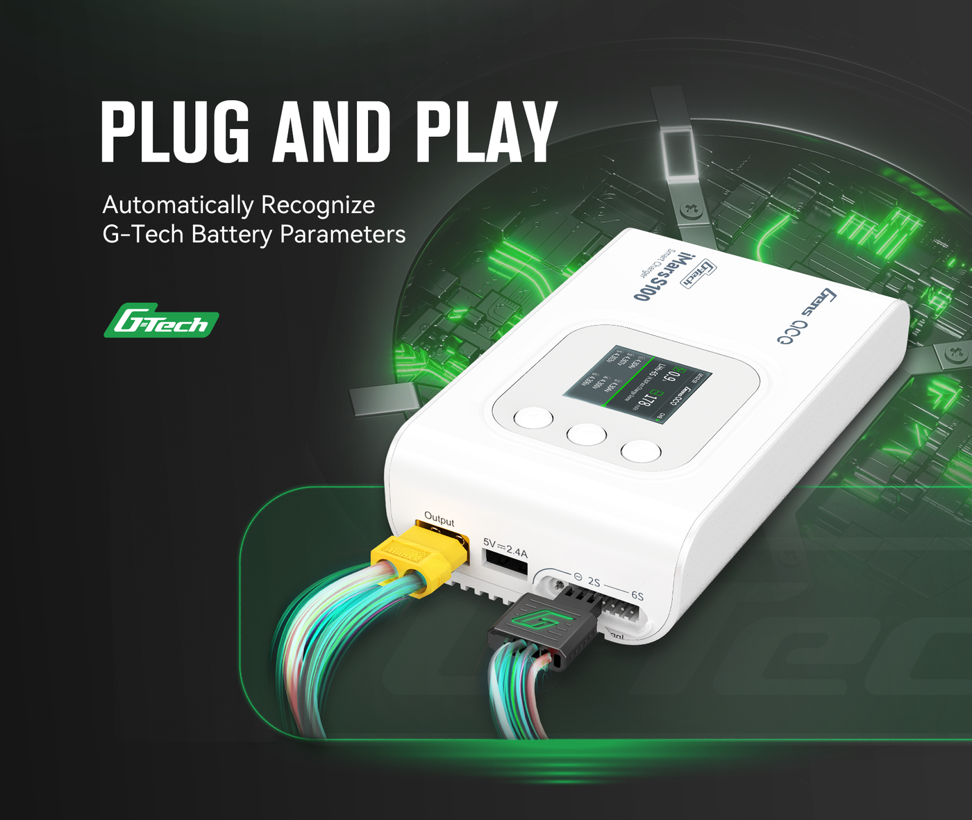 Das iMars S100 G-Tech-Ladegerät ist ein Upgrade von iMars Pro III. Als neues Mitglied von G-Tech Eco ist iMars S100 speziell für die G-Tech-Smart-Batterie konzipiert, ist aber auch mit Nicht-Smart-Batterien kompatibel.